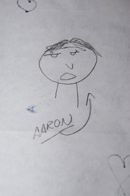 Let's see...oh yeah...brief description...although this drawing looks older than Aaron, the artist exhibitor was able to capture his dark hair and properly label said drawing:)